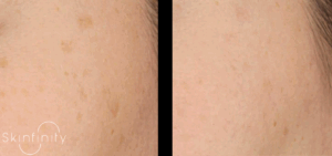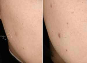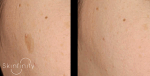 皮膚の表面に近いところにメラニンがある、浅いシミだとこのように一回の照射でとれます。