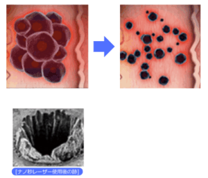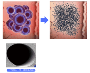ナノ秒レーザーは照射時間が比較的長いため、メラニン色素を熱で破壊する「光熱効果」が中心です。