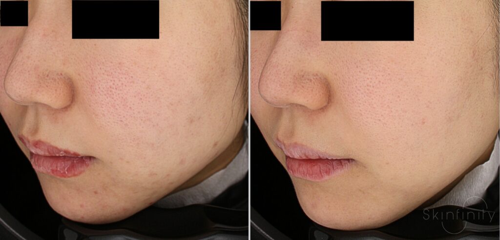 右の写真はその2回照射後から2か月ほど経過した11月12日のお写真です。2か月以上経過して症状はしっかりと定着した変化となっているのがわかります。にきびの炎症後の長引く赤みや色素沈着が落ち着くのもこのレーザー治療の特徴でもあります。2回の治療でここまで変化しておりますので、もう少し続けてみたいところです。
