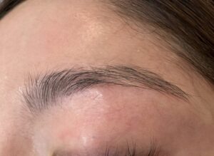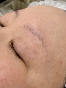 抜糸後の傷の赤みの引き具合は個人差が強いですが、早い人では1か月ほどでかなり見分けがつかない状態となる人もいらっしゃいます。長い方では半年ぐらいかけて徐々に赤みが引いていきますが、その間も眉を書いて隠される位置に切開線を作成しています。