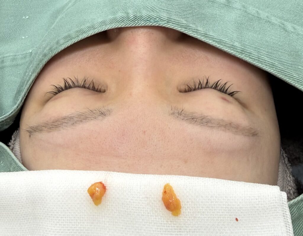 「上まぶた脂肪とり手術」直後の状態。下にならべてあるのが摘出した脂肪。