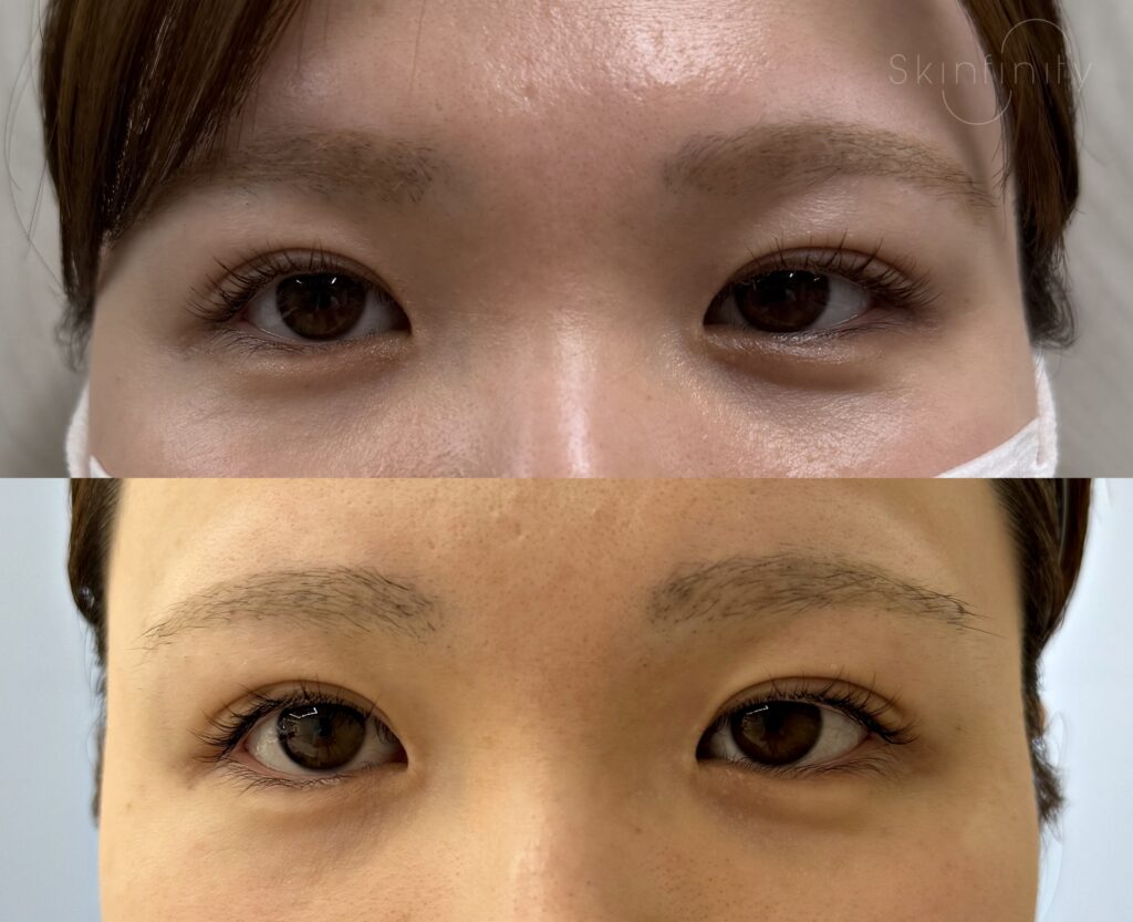 治療後は余分な皮膚が眉下切開により取り去られて、目元がスッキリした印象になっているのと同時に二重幅もご希望通りに広がっています。(この二重の幅をどの程度出したいかは手術時のデザインによって調整可能です)